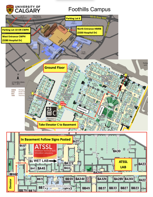 The ATSSL Special Procedures Laboratory – Cadaver Lab (HSC B723) is situated in the Basement Level of the Health Sciences Centre (HSC) at the University of Calgary Foothills Campus (See Map 1)