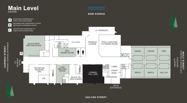 Majority of the conference events will be held in the Banff Park Lodge spaces shown in the floor plans below. There a select few workshops that will be held in the Banff Mineral Springs Hospital.